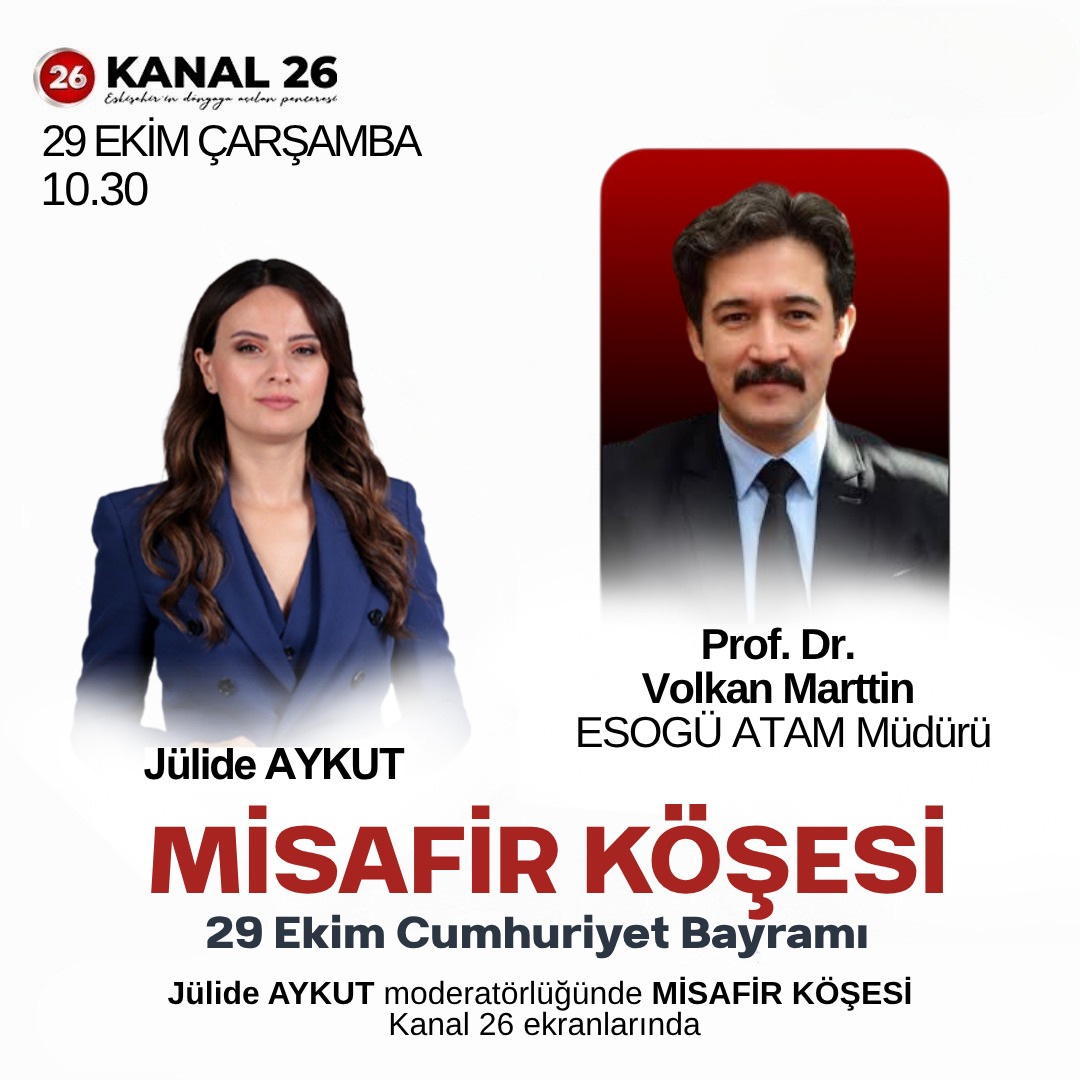 Eskişehir'in yerel televizyonu Kanal 26, Atatürk'ün "en büyük bayram" olarak tanımladığı 29 Ekim Cumhuriyet Bayramı'nın 102. yıl dönümünde, özel bir yayına imza attı. Eskişehir Osmangazi Üniversitesi (ESOGÜ) Atatürk İlkeleri ve İnkılâp Tarihi Uygulama ve Araştırma Merkezi (ATAM) Müdürü Prof. Dr. Volkan MARTTİN, Jülide Aykut'un yönetimindeki "Misafir Köşesi" programına konuk oldu. Program, Cumhuriyet Bayramı coşkusunu ve tarihsel derinliğini izleyicilere aktardı.